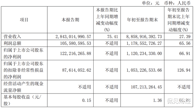 其次,从三季度财报来看,今年前三季度公司实现营收88.59亿元,同比增长27.39%;净利润为11.20亿元,同比增长66.91%;扣非净利润为10.53亿元,同比增长126.94%。