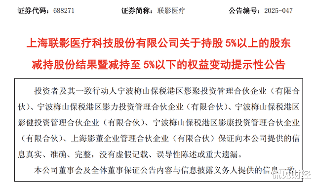 早在2024年3月,联影股份员工持股平台公司即抛出了减持计划。当时,员工持股平台拟减持不超过824万股,占总股本的1%;最终该员工持股平台一共减持约747万股,套现8.9亿元。